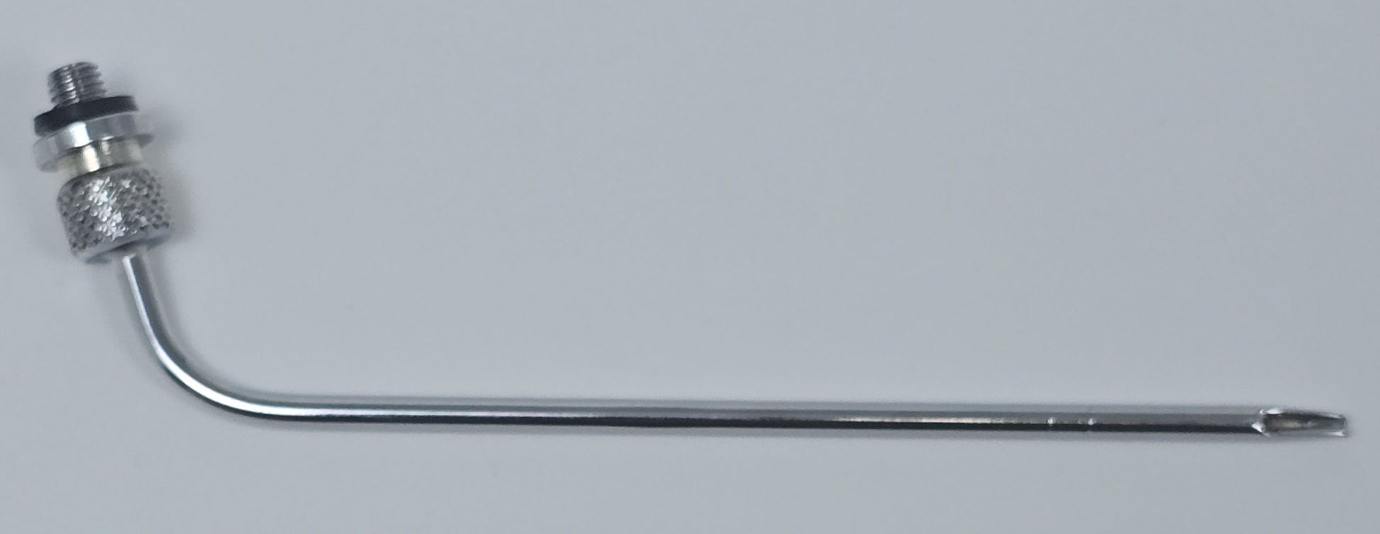 This arterial tube features a 1/8" outer diameter and a 4" working length. It is designed with a chrome finish for durability and includes a threaded hub for secure attachment. Ideal for use in embalming procedures, this tube ensures efficient fluid delivery.